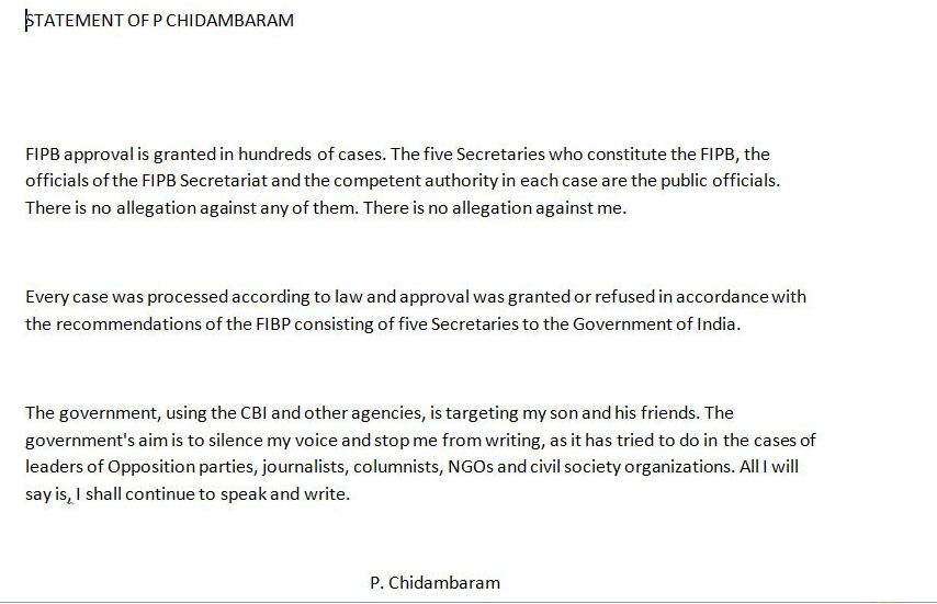 Accusing the Centre of using central agencies to target Congress leaders, especially son Karti and him, former finance minister Chidambaram issued his first statement after the CBI raids on his home (17 locations). “FIPB approval is granted in hundreds of cases,” the statement said.