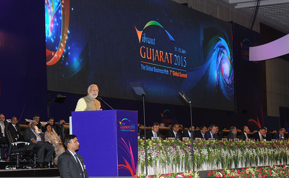 Prime Minister Narendra Modi addresses the inaugural ceremony of the 7th Vibrant Gujarat Global Summit 2015 in Gandhinagar, Gujarat on Sunday. Image courtesy: PIB[/caption] [caption id=“attachment_2040385” align=“alignleft” width=“940”]