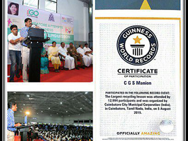 Coimbatore: An hour-long lesson last year on how to segregate waste at source, involving 12,994 people of this city, has fetched C.G.S. Manion, a member of the polyester division of Reliance Industries, a Guinness World Record. Manion, who has to his credit nearly 15 years of work towards environment protection, was selected by the Coimbatore Municipal Corporation to conduct a lesson on recycling on 5 August last year, which the Guinness has recognised. In its citation, Guinness World Record called it the largest recycling lesson. “This event was an attempt to reach a majority of local households with practical messages on waste segregation, reduce dumping of waste and recover for recycling and composting,” it said. [caption id=“attachment_2616138” align=“alignleft” width=“380”]  Image courtesy: Twitter/@theRohitBansal[/caption] The environment expert’s campaigns also work in tandem at his employer Reliance Industries’ own facilities, townships and adjoining places through a host of initiatives like the one on a sustainable system to collect and dispose used plastic bottles in a green manner. “These projects are very special to me – not for the Guinness Record, but for reaching out to our society for a genuine social cause,” said Manion, also associated with a non-profit organisation that has undertaken works like restoration of water bodies and afforestation. Named Siruthuli – a small drop of water in Tamil – the non-profit venture started with projects to rejuvenate water sources in this city and has now ventured further into afforestation, waste management and awareness programmes. “Such efforts are reflections of our company’s commitment to ‘recycle, reduce and re-use’,” a Reliance Industries spokesperson said, referring to how the company re-uses plastics to replace carcinogenic asbestos and make pre-coloured fabrics to avoid harmful dyeing later. “We see such efforts as an inspiration for our ‘go green with Swachh Bharat’ campaign,” the spokesperson said, and added that the strategy involved creating awareness on safe disposal of plastic bottles, adopt a systematic collection system and making fibres out of them. At some high-profile events like the Indian Premier League cricket matches, the venues are peppered with banners explaining safe disposal methods and calling upon patrons to bring their plastic bottles for a “greener future”. (Disclosure: Firstpost is part of Network18 Media & Investment Limited which is owned by Reliance Industries Limited.) IANS