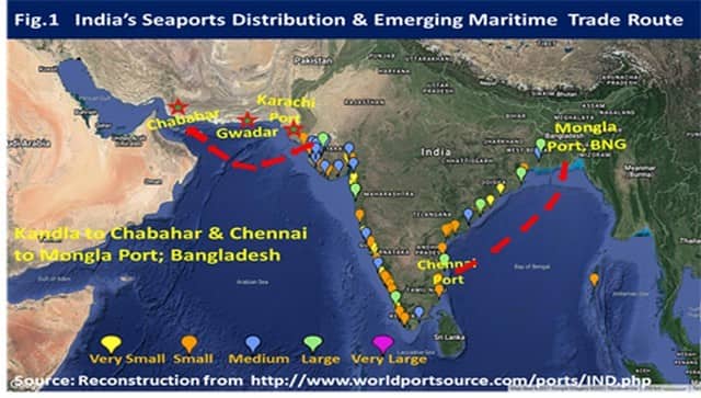 Inda’s seaport distribution and emerging maritime trade route. Image courtesy: Worldportsource.com[/caption] On the previous day, India’s maritime sector made big news exporting a consignment of 185 Ashok Leyland Truck-Chassis from Chennai Port bound for Mongla Port in Bangladesh. Trucks were being transported earlier by road covering a distance of 1,500 kilometres taking around 20-25 days with costs such as diesel, drivers and ancillary challenges like traffic, road congestion, accidents and pollution. The newer maritime mode now reduced transportation costs and took only five days to reach Bangladesh. Wheat shipment from Kandla Port to Chabahar and coastal transport from east coast of India to Bangladesh are now India’s big-picture maritime infrastructure diplomacy in the Persian Gulf and Bay of Bengal. SAGAR to Sagarmala: India’s Maritime Awakening Apart from SAGAR and its foreign policy connotations, internally India has also embarked on its most ambitious maritime modernisation programme called Sagarmala (Ocean Chains) — India’s most laudable modern maritime modernisation programme ever. The Atal Bihari Vajpayee government had conceptualised Sagarmala in 2003. However, the realisation and mission mode work beginning from 2015, it is now a grand Sagarmal 2015-2035 vision. In a timeline of twenty years and projected cost of over Rs 4 to 8 lakh crore, Sagarmala promises to revamp and modernise India’s maritime infrastructure, build port-led maritime economy and coastal connectivity which also could generate over 10 million direct and indirect new jobs. As per work progress projection data, the project cost of Sagarmala is approximately around $82.7billion (Rs 601,483 crore). Since the entire project is in phases of timeline and in partnership with provincial coastal governments and private players on PPP mode, exact project cost data widely varies. Sagarmala is based on a four pillars growth model. First, modernise seaports infrastructure and add six new ports to enhance Indian seaports’ cumulative carrying capacity. Second, improve port connectivity through rail corridors, freight-friendly expressways, inland waterways and inland ports. Third, create 14 coastal economic zones or CEZs and a special economic zone at Jawaharlal Nehru Port Trust (JNPT) in Mumbai with manufacturing clusters to enable port-led industrialisation. Finally, skill and training based coastal community development. India’s wheat diplomacy and Karachi Port Though Chabahar and India’s larger infrastructure stakes in Iran are under great geopolitical stress today, India’s wheat diplomacy via Chabahar Port is an interesting case study in recent times with immense geopolitical connotations. Soon after India’s wheat consignment to Afghanistan via Chabahar Port, Pakistan’s media became concerned about the business prospect’s of Karachi Port, that country’s largest port. [caption id=“attachment_10192811” align=“alignnone” width=“533”]