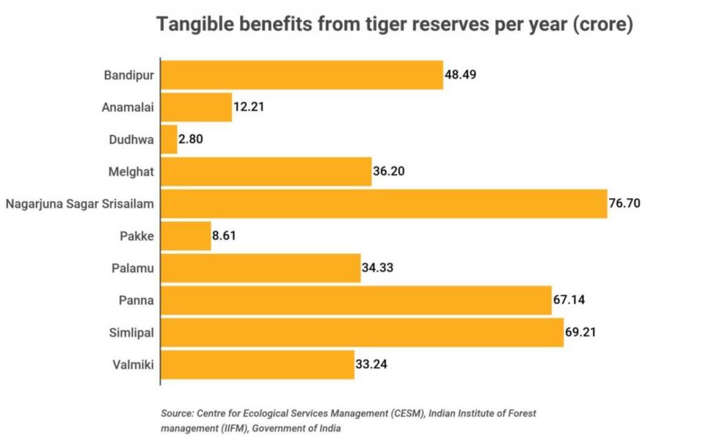 Tiger reserves provide tangible benefits such as employment generation, fishing, fodder, fuelwood, bamboo, non-timber forest products. Source: Centre for Ecological Services Management (CESM), Indian Institute of Forest Management (IIFM), Government of India.[/caption]
