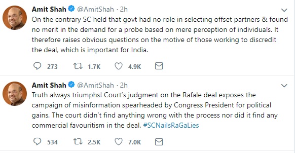 Supreme Court verdict on Rafale deal LATEST updates: Shiv Sena is not even making an attempt to hide its bitterness towards the ruling BJP government. Right after Amit Shah’s press conference after the Supreme Court verdict in Rafale deal, party’s spokesperson Sanjay Raut said, “Supreme Court has said nothing wrong. Deciding on pricing is not the Supreme Court’s job but similarly deciding on building Ram Temple is also not their job. Rafale deal issue will be sorted out in Parliament and not in Supreme Court.” Speaking to the media, Amit Shah said, “Today it has been proven that Chowkidaar is not a chor.” The truth has triumphed in the Supreme court today and Rahul Gandhi owes the people, soldiers of this country an apology, he added. Shah said that the BJP will ensure that there won’t be adjournment in Parliament if Congress and Rahul Gandhi agree to debate over Rafale deal. “I am not Rahul Gandhi. I don’t believe in false allegations.” Amit Shah also referred to Narendra Modi as the sun and said, “Supreme Court has silenced all doubts over Rafale pricing. Truth has prevailed in the Supreme Court. This is what happens when you try to throw mud at the sun.” Tearing into the Congress chief, Amit Shah said that the nation wanted to know who gives these “false” information to Rahul Gandhi. “Who is giving these informations to Rahul Gandhi? The nation wants to know. Every deal that Congress has signed they have always been corrupted but they dared to question BJP and Narendra Modi’s integrity,” said Shah. BJP chief Amit Shah slammed the Congress for playing dirty politics and said that the Supreme Court verdict is a slap on the face of the Congress and its president Rahul. The Supreme Court’s order on the Rafale deal “exposes” the campaign of misinformation against the government headed by Congress chief Rahul Gandhi, BJP chief Amit Shah said on Friday while asserting that the “truth always triumphs”. In a series of tweets, Shah said the court didn’t find anything wrong with the process nor did it find any commercial favouritism in the deal. “On the contrary, the SC held that govt had no role in selecting offset partners & found no merit in the demand for a probe based on mere perception of individuals,” he said. “Truth always triumphs! Court’s judgment on the Rafale deal exposes the campaign of misinformation spearheaded by Congress President for political gains,” he added on Twitter. The apex court’s order raises obvious questions on the motive of those working to discredit the deal, which is important for India, he asserted. The BJP has demanded an apology from the Congress and its president Rahul Gandhi for levying false allegations against Prime Minister Narendra Modi. The Supreme Court on Friday dismissed all petitions demanding a probe into the controversial Rafale fighter jet deal, asserting that the pricing and decision-making process of the deal were not in doubt. A three-judge bench headed by Chief Justice Ranjan Gogoi said, “Our country cannot afford to be unprepared when it comes to fighter aircrafts.” The bench also observed that defence preparedness needs to be looked after.