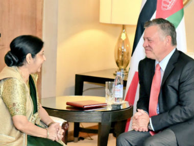 File image of Sushma Swaraj and King of Jordan Abdullah II bin Al-Hussein. Twitter @sushmaswaraj[/caption] “Historical links getting stronger!” External Affairs Ministry spokesperson Raveesh Kumar tweeted while saying that Sushma Swaraj called on the visiting dignitary. “Good conversation on strengthening ties across all sectors, specially in trade and investment, defence and security, tourism and people-to-people exchanges,” Kumar said. On Tuesday, Prime Minister Narendra Modi broke protocol and received King Abdullah — who arrived in Delhi on a three-day state visit to India — at the airport. Modi welcomed King Abdullah with a warm hug as he alighted from the aircraft This is King Abdullah’s second visit to India after his visit along with Queen Rania in 2006. Later on Wednesday, the king will visit IIT Delhi to explore collaboration with Jordan’s technical institutes. He will also participate in a CEO Round-table followed by India-Jordan Business Forum jointly organised by Industry bodies Ficci, CII and Assocham. King Abdullah will hold talks with Modi on Thursday during the course of which the two sides will discuss the entire gamut of bilateral relations as well as regional and international issues of mutual interest. President Ram Nath Kovind will host a banquet in honour of the King on Thursday while Vice President M Venkaiah Naidu will also call on the visiting dignitary. The king will also deliver a special address on “Promoting Understanding and Moderation”, organised by the India Islamic Centre at Vigyan Bhawan. India-Jordan trade stood at $1.35 billion in 2016-17, according to figures provided by the External Affairs Ministry. Earlier this month, king Abdullah hosted Modi at his residence in Amman. Jordan had facilitated Modi’s transit to Palestine in what was the first ever prime ministerial visit from India to that West Asian nation.