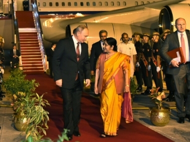 New Delhi: External Affairs Minister Sushma Swaraj received Russian president Vladimir Putin on his arrival in India on Thursday. Putin is on a two-day state visit to attend the 19th India-Russia bilateral annual summit, which is scheduled to start on Friday. The signing of a deal for Russia’s S-400 Triumf air defence system is the key feature of the visit.