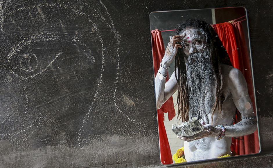 A Naga sadhu, or a Hindu holy man, applies ash at his camp before a procession during Kumbh Mela or the Pitcher Festival in Trimbakeshwar, India. Hundreds of thousands of Hindus took part in the religious gathering at the banks of the Godavari river in Nashik city at the festival, which is held every 12 years in different Indian cities. Reuters/Danish Siddiqui