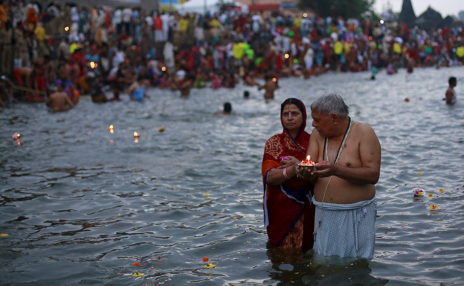 Hundreds of thousands of Hindu devotees gather to take holy dip in the river Godavari on the second royal bathing date of the ongoing Kumbh Mela. Hindus believe taking a dip in the waters of a holy river during the festival, will cleanse them of their sins. According to Hindu mythology, the Kumbh Mela celebrates the victory of gods over demons in a furious battle over a nectar that would give them immortality. AP/Manish Swarup