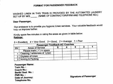 by the railway board, the contractor who handles railway linen shall make arrangements for making feedback forms available to the passengers. Such feedback forms need to be obtained from at least five passengers per AC coach in each direction.