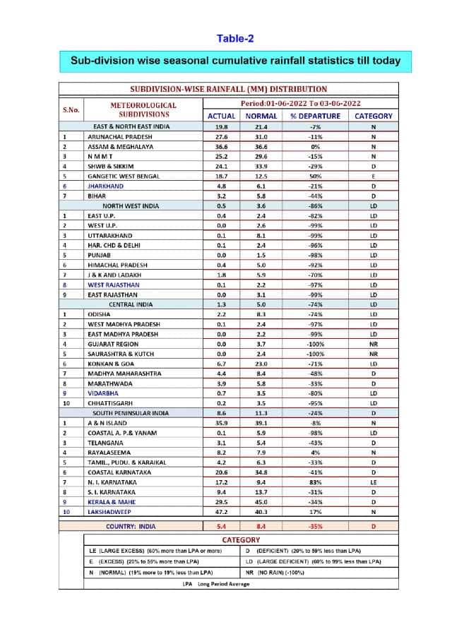 All India Weather Forecast till 11 June 2022: North India: Significant Weather Synopsis: • Dry and hot NW Winds throughout the week. • Moderate Western Disturbance over next Weekend. As the Westerly winds have resumed across most parts of North India, Weather conditions are most likely to stay dry for the next six days in Punjab, Haryana, Delhi NCR, Rajasthan and Uttar Pradesh. Except for some isolated showers, the majority of Himalayas are also expected to experience dry weather conditions over the coming week. Under the prevailing hot weather conditions, maximum temperatures are most likely to be above 40°C across the plains and nearby 45°C in West Rajasthan, South West Uttar Pradesh and South Haryana where heat waves can be observed in patches. In most parts of the Jammu division, lower Shivalik’s of Himachal Pradesh and Uttarakhand, temperatures are also likely in the range of 35 to 40°C. As per current observations, the next round of dust storms, and pre-monsoon rains are expected to pick up in many parts from 11 June. Probably by next weekend, North India will experience another round of strong thunderstorms and powerful winds and ultimately it will help in decreasing the severity of hot weather in the region. Expected Minimum and Maximum Temperature Range forecast till 11 June: • Punjab: 25 to 30.0°C, 38.0 to 43.0°C • Haryana: 26.0 to 31.0°C, 40.0 to 46.0°C • Rajasthan: 28.0 to 34.0°C, 41.0 to 47.0°C • Delhi NCR: 27.0 to 32.0°C, 40.0 to 45.0°C • Uttar Pradesh: 27.0 to 33.0°C, 41.0 to 46.0°C Central India: Significant Weather Synopsis: • Pre-monsoon rains to pick up • Development of offshore trough till North Konkan Dry weather conditions continue to prevail in most parts of Gujarat and Madhya Pradesh while pre-monsoon rains have started in parts of Chhattisgarh and Maharashtra in the past week. As the Monsoon knocked doors of South Indian states, the atmospheric instability is increasing in central parts of the country. The interiors of Maharashtra that include Madhya Maharashtra, Marathwada, Vidarbha and parts of South Central Chhattisgarh will experience scattered pre-monsoon rains and thundershowers this week. The rainfall intensity will be high in some areas along with lightning strikes. Pre-monsoon thundershowers are usually very strong in Pune which is expected to pick up in full swing by 7 June onwards. Mumbai pre-monsoon rains are expected to pick up by 7-8 June and slowly monsoon will appear over the region any time after 12-13 June. As of now, there is no good news for Madhya Pradesh and parts of Gujarat. Dry Weather is expected in the majority parts of the state until 10 June and pre-monsoon rains are may develop only post 10 June. Expected Rains in Central India till 11 June: • Maharashtra – 30mm • Chhattisgarh – 10mm • Madhya Pradesh – 5mm • Gujarat – 1mm East India and North East India: Significant Weather Synopsis: • Active monsoon flows in North East India • Scattered pre-monsoon rains in East India The northeastern parts of India continue to receive enough moisture from the Bay of Bengal. The unprecedented rains will continue to impact most parts of Meghalaya, Mizoram, Nagaland, Tripura, Manipur, Assam, Arunachal Pradesh, Sikkim and sub-Himalayan West Bengal thoroughly next week. The weather models are predicting heavy to very heavy rains in the states for the next 4-5 days, some stations may potentially get more than 200mm of rainfall in the span of 24 hours. [caption id=“attachment_10394181” align=“alignnone” width=“640”] ![Weather symbols. Image courtesy Peepo/Wikimedia Commons](https://images.firstpost.com/wp-content/uploads/2022/02/Weather_Icons640.jpg) Weather symbols. Image courtesy Peepo/Wikimedia Commons [/caption] Hot and humid weather will continue to dominate most parts of Bihar, Jharkhand, West Bengal and Odisha during the upcoming week. Scattered pre-monsoon rains and thundershowers will be observed in some parts mainly in the late afternoon and evening hours. Monsoon onset in East India is not expected before 15 June. South India: Significant Weather synopsis: • Developing offshore trough along the West Coast by the end of next week. • Wind Discontinuity in the interiors of the Southern Peninsula As per current observations, monsoon is at a very weak phase and no improvement is expected for at least the next 2-3 days. However, weather models are picking up offshore trough along the West coast which usually results in the formation of low to medium levels clouds hence rains are expected to commence in Kerala and South Karnataka Coast and the Western Ghats by next mid-week and the monsoon might cover Goa by the next weekend. Light to moderate rains will continue in various parts of Kerala and Karnataka till mid-week. The spread and intensity of rains will increase towards the weekend. Monsoon will appear over Goa and nearby regions with moderate rains around 10 June. As the Wind Discontinuity exists, rains and thundershowers are expected to continue in many parts of Tamil Nadu, Andhra Pradesh and Telangana this week. Expected Rainfall Accumulation in the Southern states till 11 June: • Kerala: 70mm • Karnataka: 40mm • Goa: 30mm • Tamil Nadu: 30mm • Telangana: 20mm • Andhra Pradesh: 20mm The author, better known as the Rohtak Weatherman, interprets and explains complex weather patterns. His impact-based forecasts @navdeepdahiya55 are very popular in north India. Read all the Latest News , Trending News ,  Cricket News , Bollywood News , India News and Entertainment News here. Follow us on Facebook, Twitter and Instagram.