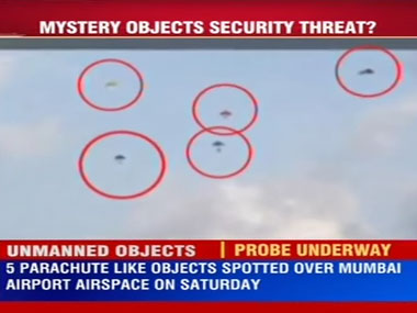 Mumbai: Unidentified parachute-like objects were spotted in the Mumbai airport airspace, raising security concern. [caption id=“attachment_2261304” align=“alignleft” width=“380”] Screenshot from Youtube video.[/caption] According to airport police, five unidentified objects were spotted over the airport area on Saturday evening by a pilot of Jet Airways just before take-off. He immediately alerted the Mumbai airport’s Air Traffic Controller about the incident, airport police said. The authorities of the Mumbai International Airport Limited (MIAL) were also informed about the objects spotted over the airport. MIAL immediately alerted the airport police station, a MIAL official told PTI. The matter has also been brought to the notice of Mumbai’s Joint Commissioner of Police (Law and Order) Deven Bharti.