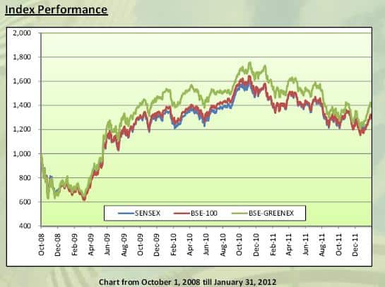 • According to an exchange release, over the past 12 months, the BSE Greenex Index fell only 6.26 percent compared with the Sensex, which was down 9.2 percent, and the BSE 100, which was down 6.2 percent.