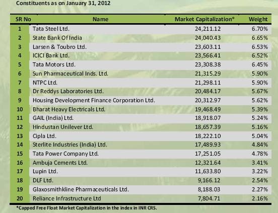 •Tata Steel has the biggest weight in the index at 6.7 percent, followed by State Bank of India (6.65 percent), and Larsen and Toubro (6.53 percent). Reliance Infrastructure has the lowest weight of 2.16 percent.