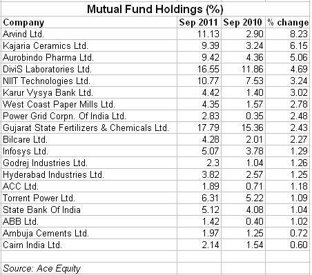 The biggest jump in mutual fund holdings was seen in Arvind Ltd: shareholding increased by a sharp 8.23 percentage points at the end of the September-ending quarter from the same period a year ago. Happily for the shareholders, the stock surged by more than 100 percent over the next 12 months to Rs around 104.