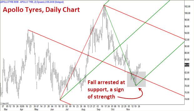 Apollo Tyres (Rs.84.45): This stock was in a downward correction off the 13 September high of Rs 102.45. The recent price action suggests that this correction is over and the next leg of the rally appears underway.