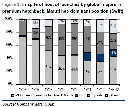 In the premium hatchback car market, there have been a slew of new launches like Ford Figo, Volkswagen Polo, Nissan Micra, Volkswagen Vento, Hyundai Eon, Honda Brio, Hyundai Verna and Maruti Dzire (New). Still, Maruti has maintained its leadership position in the market. Hyundai was the biggest loser, since it has no diesel variant of its car model ‘i10’.