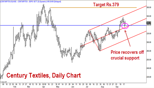 Century Textiles (Rs.344.40): The short-term outlook for the stock is bullish and the recent price action suggests that a rally to Rs 379 is likely. The completion of the “key reversal day” pattern on Friday along with increased trading volume is a sign that buyers are active.