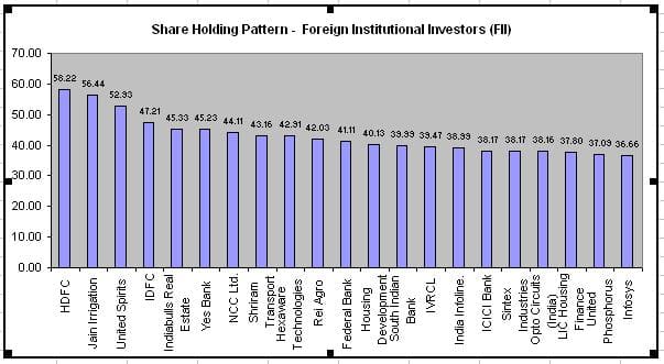 • HDFC takes the top spot with a FII stake of 58.22 percent for the September quarter. Over the last one year its stock has fallen by only 11.37 percent compared to a steeper 20 percent fall in the Sensex. Today it was trading lower by one percent at Rs 619 vis Sensex rise of 0.19 percent.