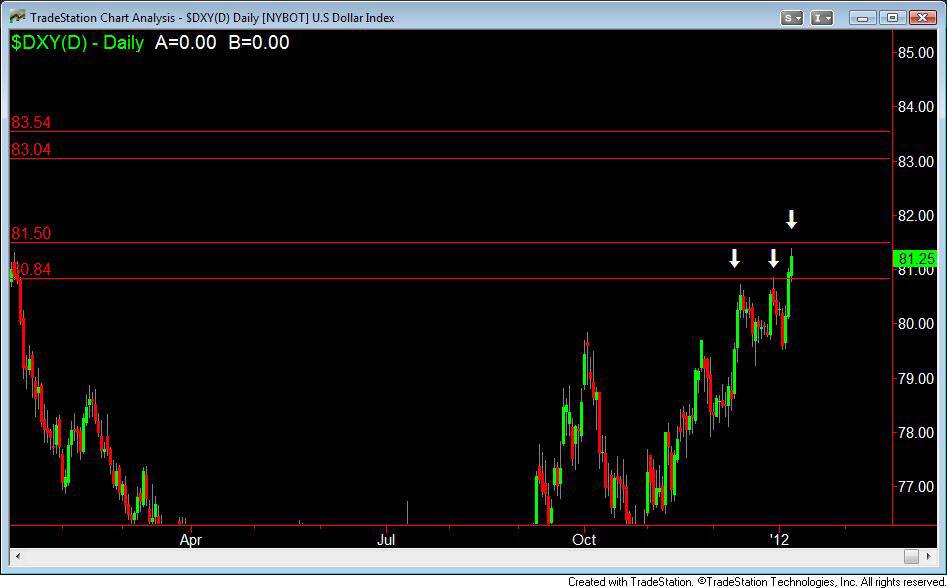 If the index closes above 81.50 on any trading day, the dollar can rally higher. The number of times that the index hit the resistance level is shown on the chart with white arrows ( Click here for the dollar index chart ).