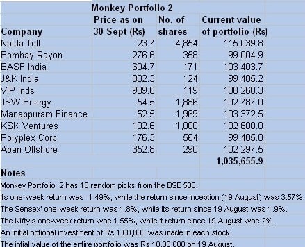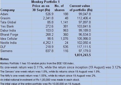 Over the past few weeks, our Monkey portfolios have caused quite a stir among the investing public because of their sizzling run in the stock markets. For the period since inception on 19 August, Monkey portfolio 1, for instance, pocketed a 3.1% gain against the Sensex’ and Nifty’s gains of 1.5-1.8%.
