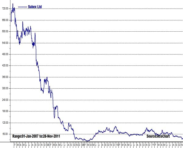 The $180 million FCCBs, which were originally raised in 2006-07 with a conversion price of Rs 656.20, have been restructured and partly redeemed. A major portion of the restructured FCCB is to be converted at Rs 80.31 at an exchange rate of 48.17. The remaining portion (around $39 million of non-restructured FCCB) hopes to get converted at the original conversion price of Rs 656.20, or redeemed at the issued value. The current exchange rate of Rs 52 makes the conversion price 10 percent higher at Rs 88. With Subex trading at Rs 35.30 on Monday, and reporting a net loss of Rs 12.95 crore in the second quarter there is little chance that the stock will reach anywhere close to the trigger price by March 2012, when the conversion is due.