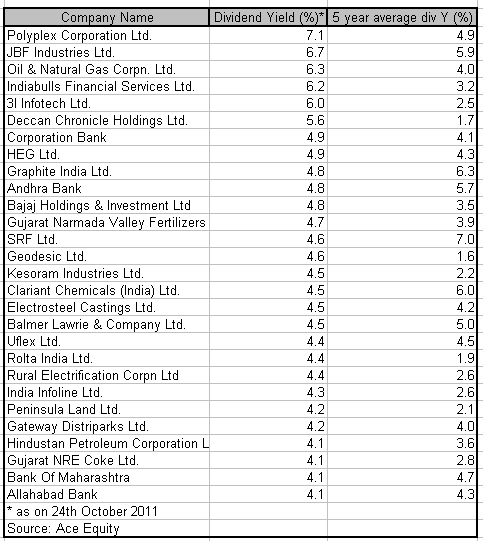 Some other companies worth mentioning are Graphite India, SRF India and Clariant Chemicals (India): their five year average dividend yields were much higher than their current yields.