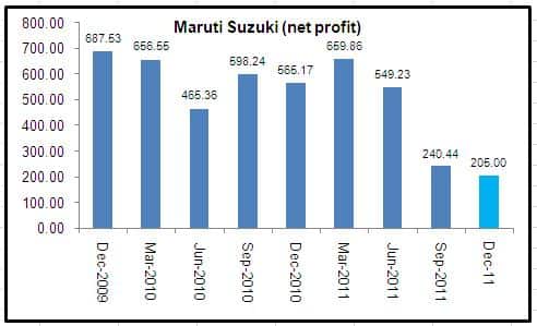 Maruti Suzuki has reported a sharp 63.6 percent fall in its net profit to Rs 205 crore for the December quarter, its lowest since September 2004. This fall was in line with what most analysts expected. According to a CNBC TV-18 poll, its net profit was expected to fall to Rs 200 crore.