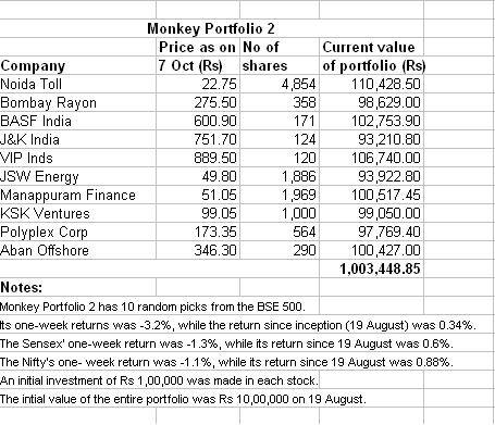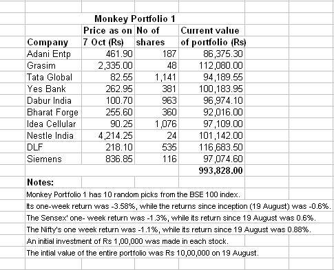 The big winners in Monkey portfolio 1 were DLF, which surged by 17 percent, and Grasim, up by a hefty 12 percent, although those gains were erased by losses in Adani, Bharat Forge and Tata Global, which lost between 5 percent and 13 percent.