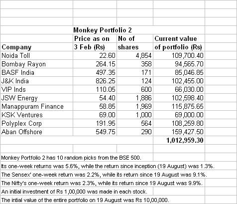 Monkey portfolio 1, consisting of 10 randomly-selected stocks from the BSE 100 , wrapped the week with a 5.7 percent gain, while Monkey portfolio 2, comprising 10 randomly-picked stocks from the BSE 500 , scooped up a 5.6 percent gain.