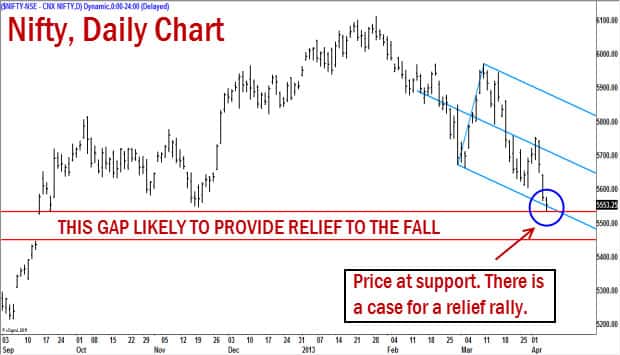 The fall has pushed the index to an area of support in the 5,440-5,520 range, which is the huge upside gap recorded in September 2012. The index is at oversold levels and near an area of support which supports the case for a counter-trend rally.