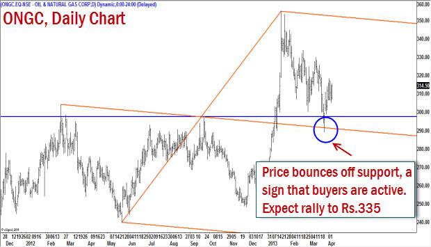 ONGC (Rs 314.50): This stock has been in a downward corrective phase in the past few weeks. This downward move has been arrested at the key support at Rs 290-300 range and the price action in the past few days indicates that the stock could seek higher levels from a short-term perspective. See chart here