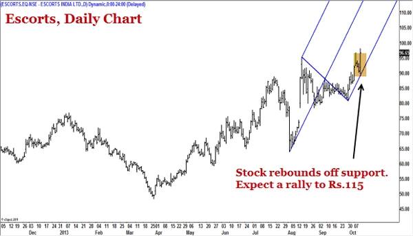 Escorts (Rs.97): After a sideways consolidation, the stock has resumed its uptrend a couple of weeks ago. The pick-up in momentum and trading volumes suggests that the buying interest in the stock. The short-term outlook is positive and the stock could rally to the immediate target at Rs.115.