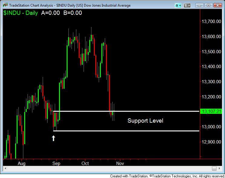 Now let us take a look at the Dow Jones Industrial Average ( click here for the Dow chart ). Notice that the Dow is back at an area of support as shown by the two white horizontal lines. This is an area of support as prices had rallied from that level earlier and could do so again. However, if the index breaks that support level, which is around 12,975, the index could go lower. But so far the support has held for three days. In the case of the Nifty, however, the support level has been hit many times, thereby weakening it.