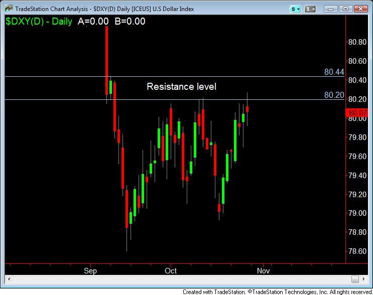 Now finally let’s take a look at the dollar index ( Click here for the Dollar index chart ). Notice that the resistance level has been hit multiple times. If the resistance is broken the index could rally much higher. A rally in the dollar index is a negative for the equity markets.
