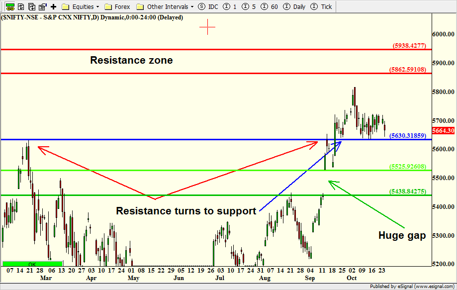 Since 9 October, the Nifty has moved in the range of 5,725 and 5,635. On Friday the index fell as low as 5,641 before closing higher. This is clearly a range-bound market. Notice that the price has come down to the the 5,635 level multiple times, which is weakening the support at the 5,630 level. That support is shown by the blue horizontal line. We call it support as that is the level from where prices had rallied on 26 September, as shown by the blue arrow. It was also resistance earlier, which is shown by the red arrows. Former resistance levels often turn to support when prices rally above the resistance level.