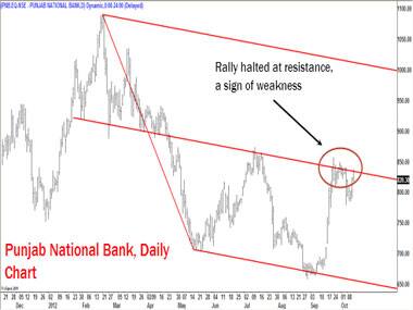 Punjab National Bank (Rs 820.30): The stock moved up sharply in the past few weeks and the rally was arrested right at the resistance at Rs 840-850 range. The inability to get past the resistance is a sign of weakness and the recent price action suggests that a slide to Rs 750 is likely.