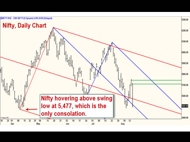 Despite the fall on Friday, the Nifty has not yet breached the major swing low of 5,477, which is the only consolation at the moment. A fall below this level would suggest that the next leg of the downtrend to 5,250-5,300 is underway.