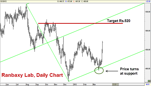 Ranbaxy Laboratories (Rs 469): The short-term outlook is bullish and a rally to the immediate resistance at Rs 520 appears likely. It is positive to note that the stock took support at the green upsloping line displayed in the chart.