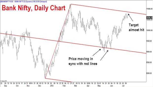 CNX Bank Index (10,594.45): The index fell 100 points short of the target of 10,880 mentioned last week. After touching a high of 10,782 on Wednesday, the index ruled weak in the remaining two trading sessions. In the attached daily **chart** , it is apparent that the price has moved in sync with the red set of lines.