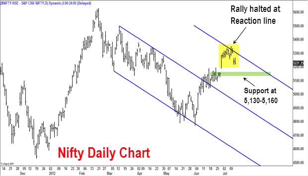 S&P CNX Nifty (5,227.25): The Nifty index moved in line with expectations and tested the support zone of 5,250-5,260 mentioned in the week before. The market sentiment was spooked by Infosys’ first quarter earnings announced on Thursday. The Nifty opened with a huge gap-down on Thursday and failed to recover thereafter.