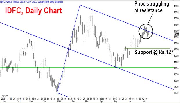 IDFC (Rs 137.40): The stock, featured earlier in this column on 9 June, has almost hit the then mentioned target of Rs 145. The price action in the past few days indicates that the stock is struggling to make progress beyond the key resistance at Rs 145. See **chart** here.