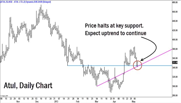 ** Atul (Rs 354.1) :**The recent chart patterns suggest that the stock has completed its downward correction from the high of Rs 472 recorded in December 2012. The sequence of higher highs and higher lows recorded off the 26 March low of Rs 287 indicates that a short-term uptrend is underway.