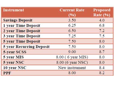 If the recommendations are accepted in toto, the basic savings deposit rate for 2011-12 will rise to 4 percent from 3.5 percent to align the rate with the bank savings rate. Time deposits will be higher by 0.25-0.55 percent, with PPF getting 8.2 percent ( See chart ).