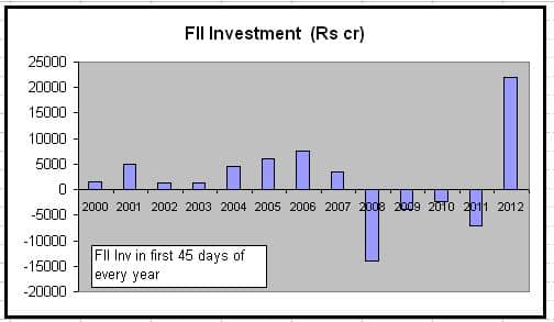 The main reason for the sharp 18 percent rise in indices is the Rs 22,000 crore FII money that has entered the country, the highest ever, since Sebi started disclosing the data in 2000. Inflows in the first 15 days of February, at Rs 11,681.7 crore, were higher than that for the entire month of January 2012, which stood at Rs 10,907 crore. This means around $4 billion of money has already flown into the country in the first 45 days of this year. It has resulted in Sensex moving from a low of 15,358 0n 2 January 2012 to 18,231 on 15 February.