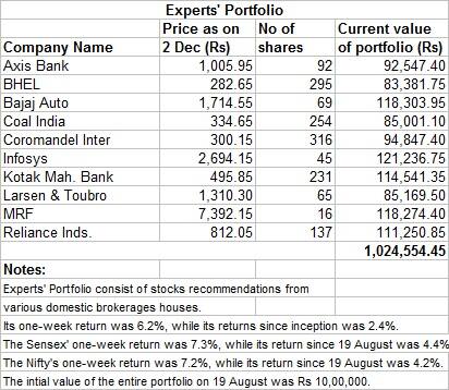 Coming in last were the Monkeys: Monkey portfolio 1 - a collection of 10 randomly-selected stocks from the BSE 100 – added on 5 percent, while Monkey portfolio 2 - a selection of 10 randomly-selected stocks from the BSE 500 – gained a meagre 3.3 percent.