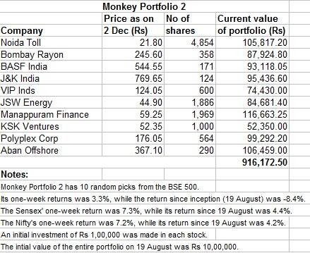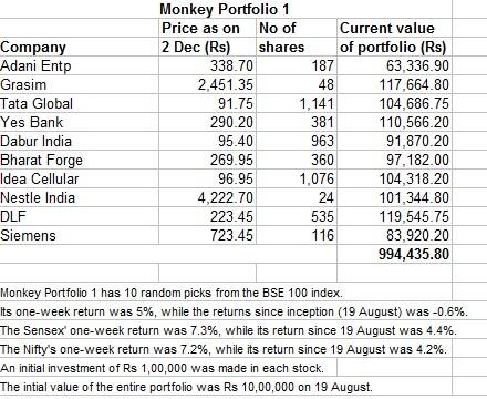 Monkey portfolio 1 was dragged down by Adani Enterprises, which shed a whopping 36 percent, and Grasim, which sank 18 percent between 19 August and 2 December.