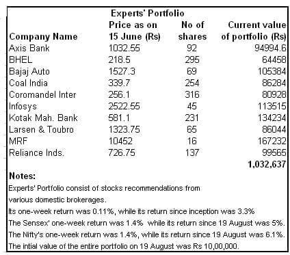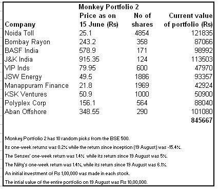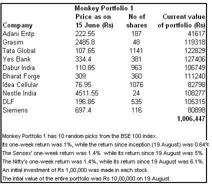To be fair, the Monkeys and brokers didn’t do too badly for the week ending 15 June either. Monkey portfolio 1, consisting of 10 randomly-picked stocks from the BSE 100 , advanced 1 percent, while Monkey portfolio 2, comprising 10 randomly-selected stocks from the BSE 500, added on 0.2 percent. The experts’ portfolio, a collection of 10 stocks hand-picked by 10 market whizkids , closed the week 0.11 percent higher.