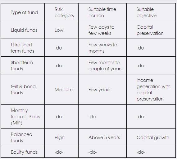 Image Courtesy: Canara Robeco[/caption] Much like everyone else, you too would have, felt this when you stepped into an ice cream parlour. Just a glance at the menu card or the variety at display is enough to send you into a tizzy; flavours galore with choices of cups, cones and sticks. And all of them look so lip-smacking that you keep changing your mind almost every second. Well, you may feel, the scenario in case of mutual funds too is quite similar. There are a few thousand funds in the dozen or so broad categories that they are classified into. It looks like a maze for the new entrant and even some old timers. If you too are unable to decipher the maze, the best option would be to seek professional help from a competent and trusted advisor. However, if you want to attempt finding suitable investments on your own, here are some pointers that would help you zero in on the fund of your liking. 1.Identify your investment horizon: When you have some funds to invest, you would normally have a plan about how you want to utilize it ultimately. For instance, you may want to save up for the down payment of your dream home in two years’ time or put it away for your retirement which is fifteen years away. Knowing your investment horizon would be the first step in selecting a suitable investment. 2.Identify your investment objective: While investing, your objective could be to aim for: Growth of capital, if your financial goal is a long term one. An example would be the retirement goal identified above. Preservation of capital, if your goal is short term, like the down payment goal identified above. Generation of regular income, if you are investing a lump sum with an aim of drawing it down over a period of time. An example of this would be a retired person wanting monthly cash flows for his living. Objective, in some cases, could also be tax saving or even generating a particular rate of return without going through the above process elaborately. 3.Know your risk profile: This has three major components. Risk requirement: What is the extent of risk that your financial position forces you to take? This depends on the gap between where you are and where you want to go. If the gap is large, you may need to take higher risk and vice-versa. Risk tolerance: What is the extent of risk that your present financial health allows you to take? If you are too deep in debt, you may not afford to take much risk. Risk appetite: What is the extent of risk that allows you to have a good night’s sleep? If you do not have the stomach to tolerate the gyrations, you would do well to alter your investment strategy accordingly. Each of the following fund categories exhibit different characteristic suitable to different kinds of investors: