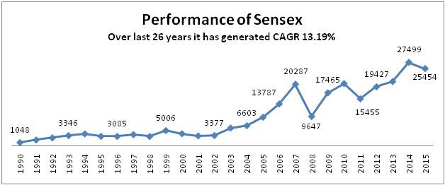 Illustration disclaimer: The above example is only for illustration purposes & shall not be construed as indicative yields/returns of any of the Schemes of Canara Robeco Mutual Fund. When the concept of speculation or gambling is involved, one person’s gain is other person’s loss. The outcomes are quick and the parties involved would know whether they have made or lost the money. When the concept of speculation or gambling is involved, one person’s gain is other person’s loss. The outcomes are quick and the parties involved would know whether they have made or lost the money. Investment is a scenario where it would be a win-win situation for all the parties involved. The outcome may take longer, but the benefits are worth the wait. When an investor invests money in a growing business, he will have to give time to the business to perform and start reaping the benefits in the years to come. One can relate this to sowing a seed and nurturing before reaping the fruit. Investing is a well-evaluated and disciplined process. Why should the stock prices go up and companies perform in the long run? When we look around, the whole universe is coming together to ensure we are spending. One can spend money just at a click of a button and our economy is thriving on consumer spending. For the sake of example, let’s assume an individual has been a customer of Airtel since October 2002 and if his average monthly mobile bill is Rs.1000/- he would have spent Rs. 156,000/- till September 2015. Every customer paying the bill paid adds-up to the revenue of the company and over the years the company has grown leaps and bounds so is the share price. Along with paying Rs. 1000/- towards the mobile bill, if another Rs. 1000/- every month had been invested in Airtel equity shares, the value would have grown to 530,000/- as on September-2015, giving annual returns of 16.31%. The craze of Apple products across the world has made Apple Inc built a cash reserve of $ 200bn and last 10 years it has yielded returns of 33%p.a. When we spend companies make money. We can earn the money that we have spent on the companies by investing in their shares. Performance of Sensex: If one looks at the performance Sensex over last 26 years, there are quite a lot of ups and downs and volatile. But had an investor waited for 26 years, he would have earned the average returns of 13.19% p.a. CAGR over years. [caption id=“attachment_2562320” align=“alignleft” width=“628”]