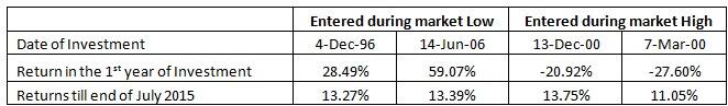 A million dollar question which people tend to ask before investing is, “**when is the right time to invest in mutual fund/equity market?”**Conventional wisdom says - enter when the markets are low or enter when P/E ratio falls below a certain threshold so on. Multiple theories advocate right time of investing. The fear is “what if I invest and market crashes after I invest?”, in such cases portfolio would be under loss. Let’s assume, few of our investors were accurate in predicting the market lows and invested in Sensex/index fund right at the bottom of the market in the given period. Let’s say some of the investors got carried away with the Bull Run and invested Growth Fund at the market peak. How much of difference would it make in the short term and in the long run; One time investment in Sensex – at various market levels The table given below talks about the returns generated by both the set of investors who invest when the market was low and when the market was high:
