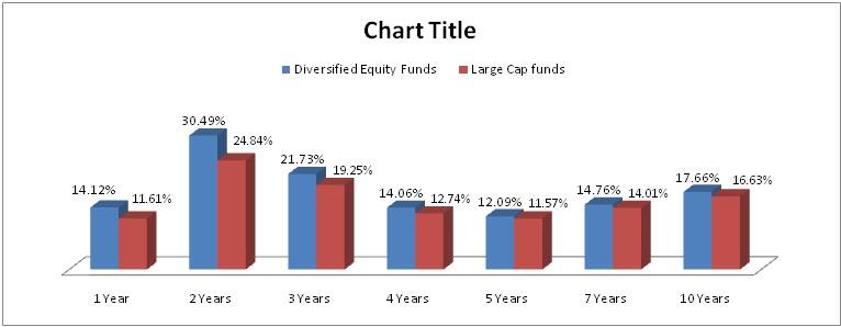 Image Courtesy: Canara Robeco[/caption] A farmer in his farm land doesn’t grow only one crop. For ex: a coffee estate owner would grow coffee, pepper, silver trees, Oranges, Jack fruit and maintain live stock all at once to diversify his risk from coffee prices. Mutual funds become a viable alternative to investing in equity directly yet reducing the risk. Mutual Funds generally are made up of a combination of 40 to 60 stocks (the number of stocks in a fund can vary based on the investment objective or the fund management style) in one fund that helps investor diversify the risk. Diversification could involve investing in multiple stocks across various sectors. Isn’t it better to bet on a team than on a single player? Performance of Large cap and Diversified Equity Funds:
