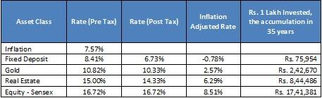 Equity is one the key asset class which beats inflation hands down in the long run. Performance of Asset Classes over 35 years (Annualized Returns) – Inflation @ 7.57%
